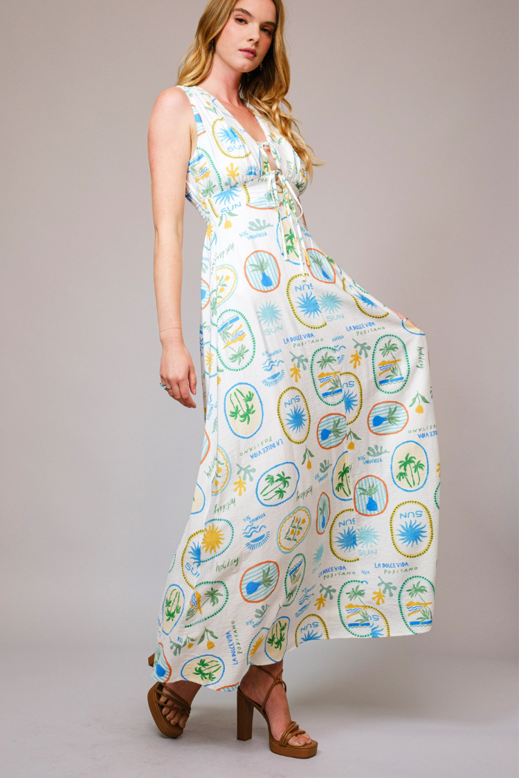 Nothing says vacation like a playful print! Our Fun in the Sun Maxi Dress is a classic white maxi dress with an all-over colorful travel stamp print. V neckline and slightly open back with adjustable ties to give you the perfect fit. Smocked waist at the back. This is THE dress of summer.
