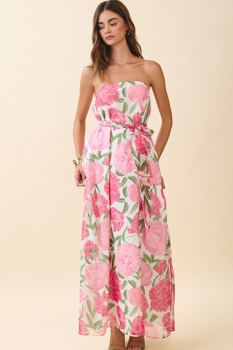 Strapless design with convertible scarf / pockets / Floor-length / Pink and coral floral print on white background / Relaxed, flowy silhouette / available in sizes S-L