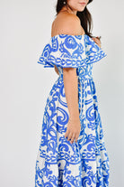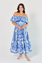 Bring the magic of the Mediterranean anywhere with the Catania Tile Midi Dress. Inspired by hand-painted Italian ceramics and sun-soaked coastal towns, this blue and white off the shoulder midi dress is your go-to for jet-setting in style. Featuring an easy, breezy fit and flare silhouette, this style is perfect for dinner dates and bridal and baby shower guest appearances. Hidden zipper back.