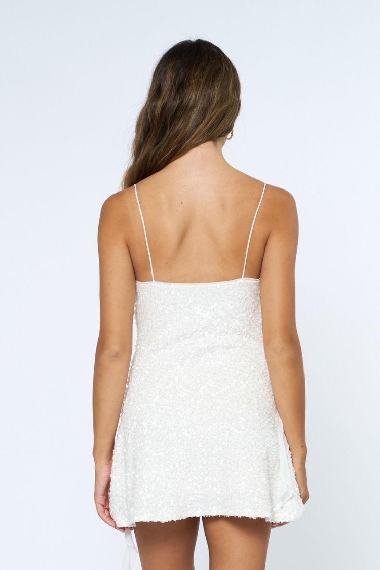 Turn heads at your bachelorette in The Last Fling Sequin Mini, a sparkling white sequin mini dress designed for unforgettable bride-to-be moments. Featuring delicate spaghetti straps, a softly draped neckline, and an all-over sequin finish, this dress catches the light with every move.