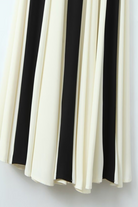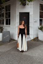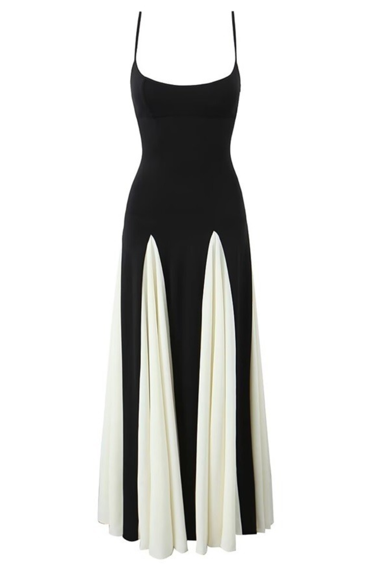 scoop neckline / fitted bust and waist with stretch / full black and white paneled skirt / adjustable shoulder straps / maxi length